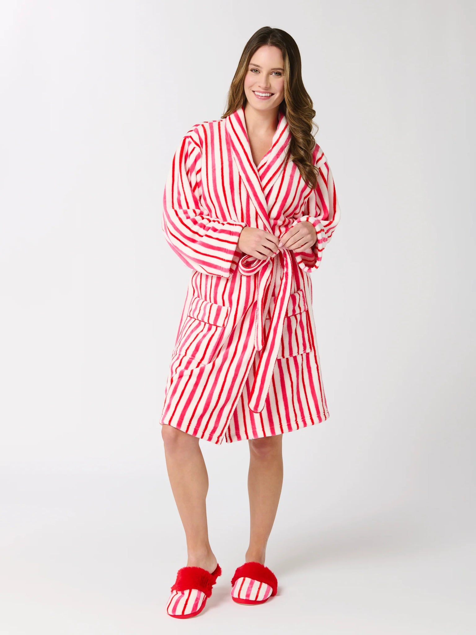 Wrap yourself in cozy holiday cheer with the Candy Stripe Robe. Featuring playful red and white stripes that channel serious peppermint bark energy, this robe is made from ultra-soft fleece that feels like a warm hug. The wide collar, front pockets, and self-tie belt add just the right mix of comfort and convenience. Whether you're sipping cocoa or lounging fireside, this festive favorite brings all the sweet vibes.