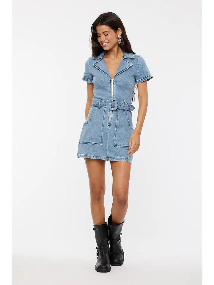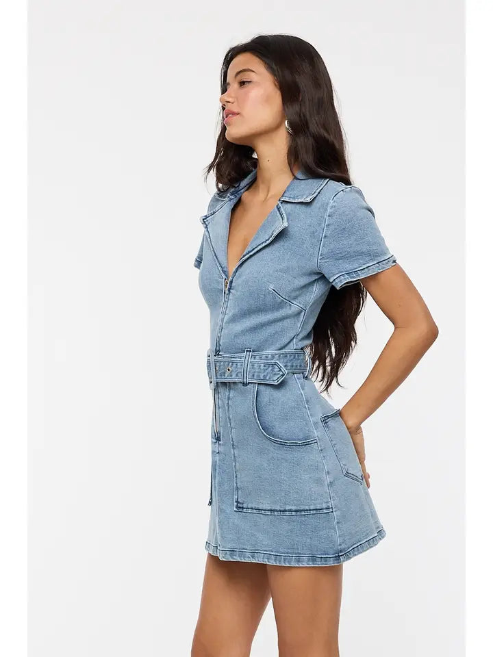 Step into effortless style with this playful light denim mini dress featuring a classic collared neck and a front zipper for easy wear. Practical side and back pockets add a cool, casual vibe, while the included belt cinches your waist to highlight your silhouette. Perfect for days when you want to mix comfort with a touch of fun.