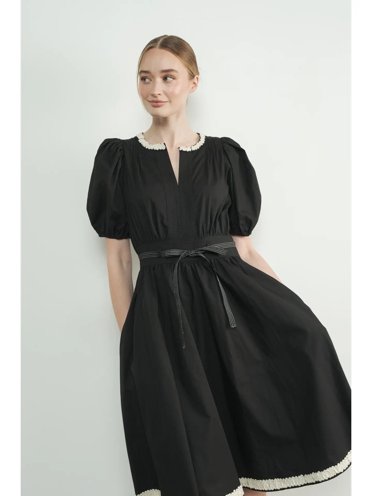 This charming black and white midi dress features delicate embroidery that adds a touch of whimsy to your wardrobe. Perfect for brunches, garden parties, or casual date nights, it combines classic colors with playful details. The flattering midi length keeps you comfortable while looking absolutely adorable from every angle!