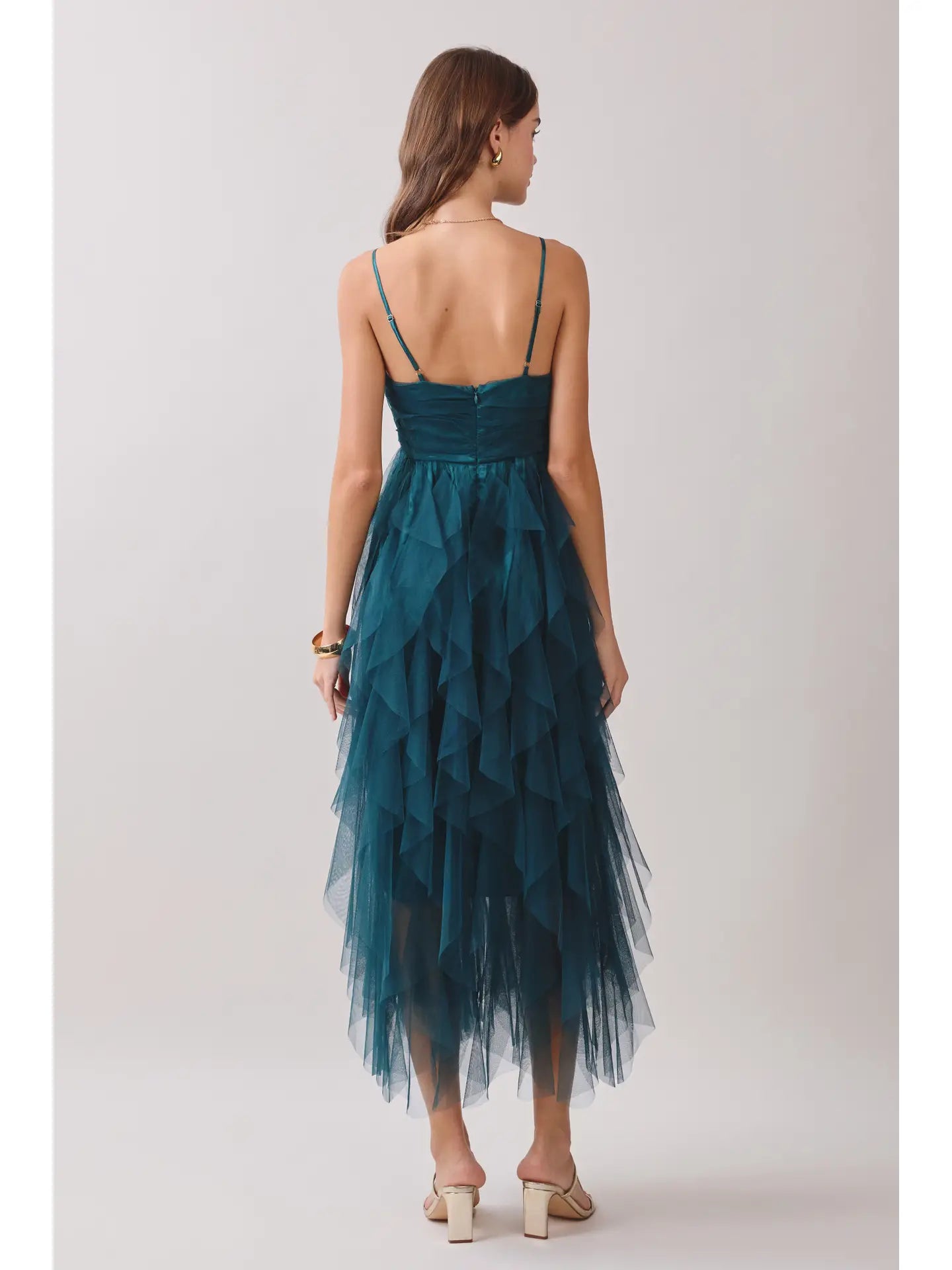 Twirl into the spotlight in this enchanting glitter mesh midi dress! Cascading ruffle tiers create a dreamy, dimensional silhouette that catches light with every move. The shimmering glitter finish adds just the right amount of sparkle for parties, celebrations, or whenever you want to feel extra fabulous. Perfect for making a statement without saying a word—this dress is pure joy wrapped in ruffles and shimmer.