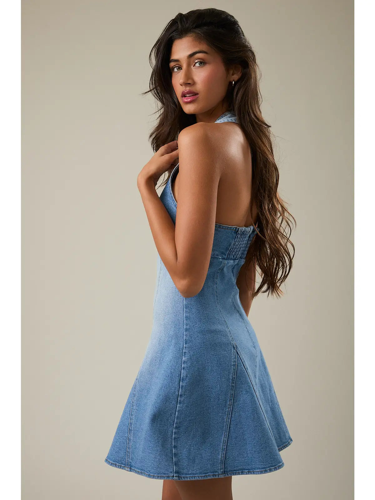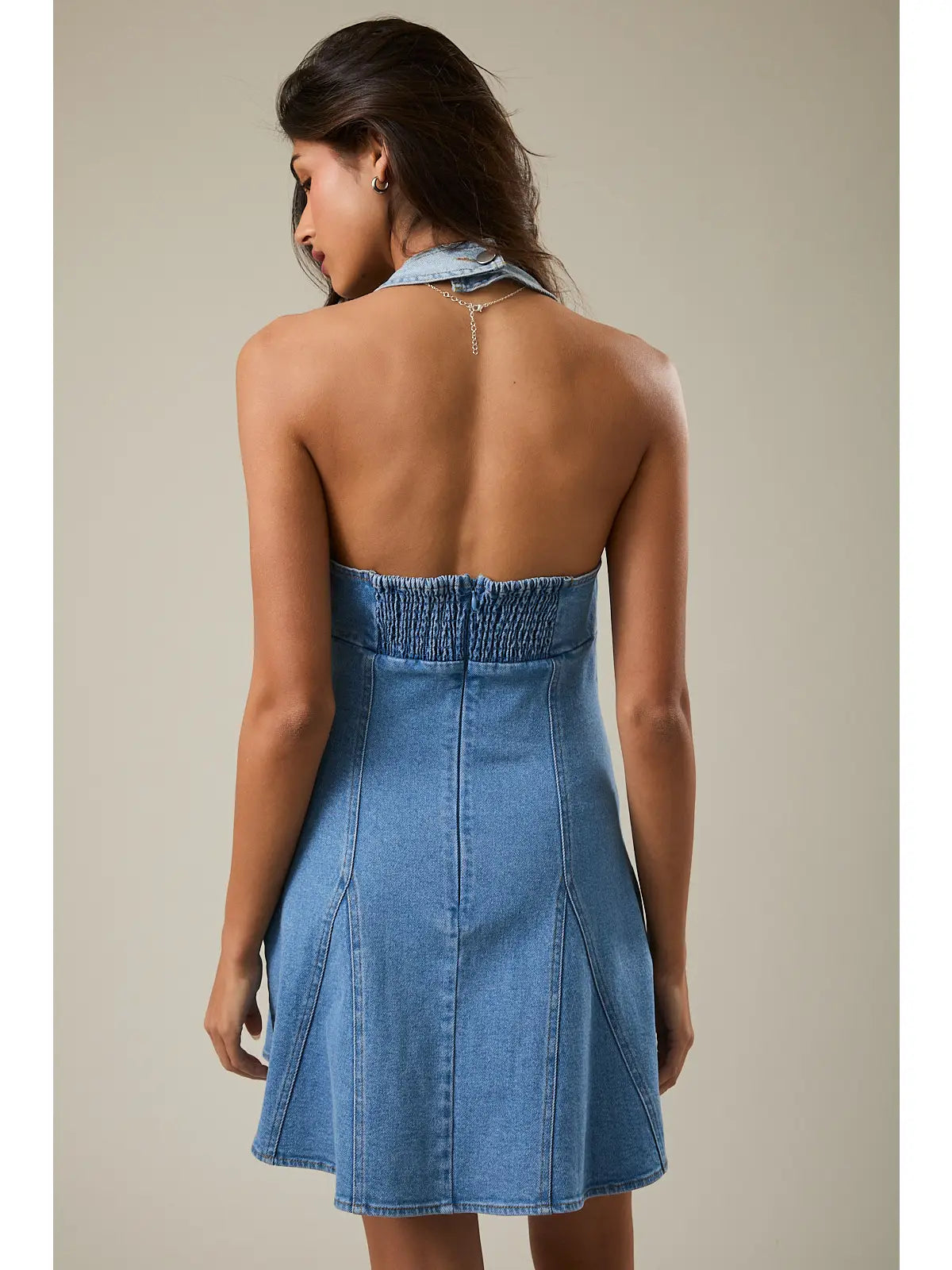 Perfect for festival season and game day vibes, this halter neck denim mini dress combines classic style with modern edge. The adjustable halter ties offer a flattering fit, while the timeless denim fabric keeps you comfortable all day long. Pair it with sneakers for a casual concert look or dress it up with boots for a night out. A versatile wardrobe essential that works for any occasion.