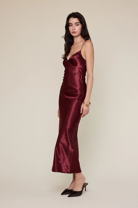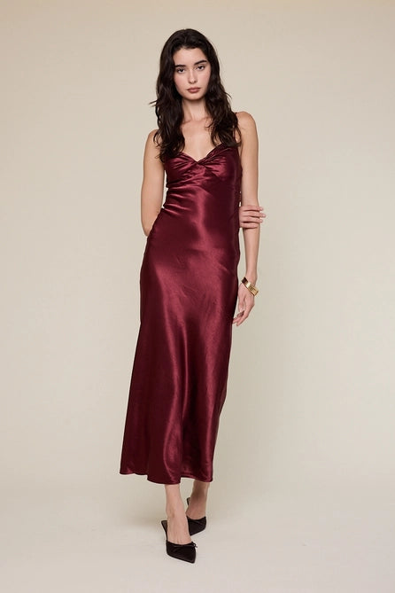 This satin midi dress features a playful sweetheart neckline and a twisted ruched bust that adds flirty texture. Its sleeveless design and stretch straps ensure comfort and ease of movement, while the side zipper offers a sleek finish. Cut on the bias, the dress gracefully skims your silhouette down to ankle length, creating an effortlessly elegant look perfect for any fun occasion.