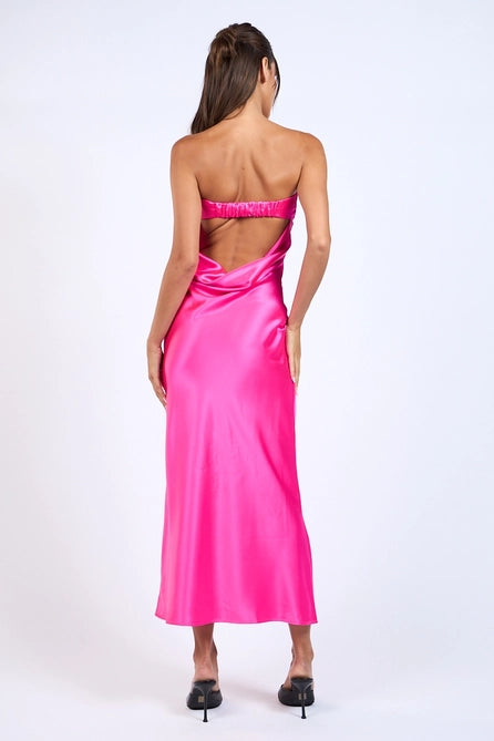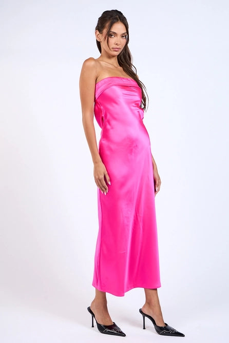 This playful midi dress features a sleek satin print and a flattering straight-across, strapless neckline. Its open back is complemented by a delicate lining band for comfort and style, making it perfect for turning heads at any event. Effortlessly chic and fun, it’s your go-to for a standout look with a hint of cheeky charm.