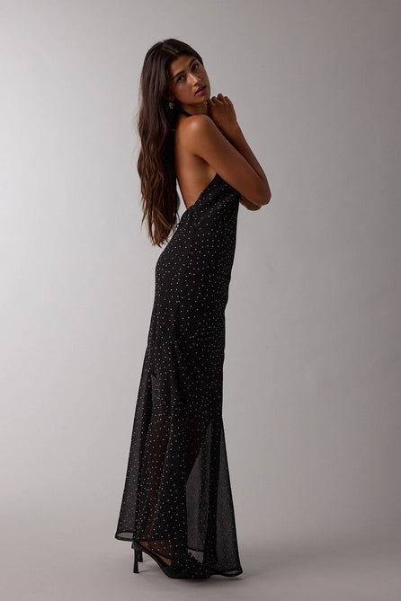 Turn heads in this playful floor-length maxi dress featuring a sheer ditsy polka dot print. Its plunging halter tie neck and sleeveless design keep the look flirty and fresh. An open back with a waist tie adds a touch of allure and adjustable comfort, perfect for dance floors or sunset strolls alike. Embrace effortless charm with every step.