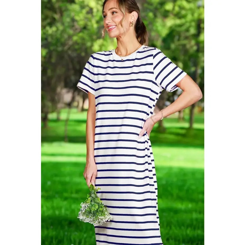 Get ready to slay in this Striped Crew Neck Maxi Dress! With its Short Sleeves and Side Slit, you'll rock the perfect blend of style and comfort. Say hello to effortless chic and hello to summer!