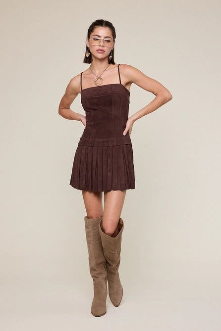 Step out in style with this suede brown mini dress featuring a fun square neckline and playful pleated details. The adjustable straps and side zipper ensure a perfect fit, while the sleeveless design keeps it light and breezy. Ideal for mixing and matching, this solid color dress is your new go-to for effortless, flirty fashion.