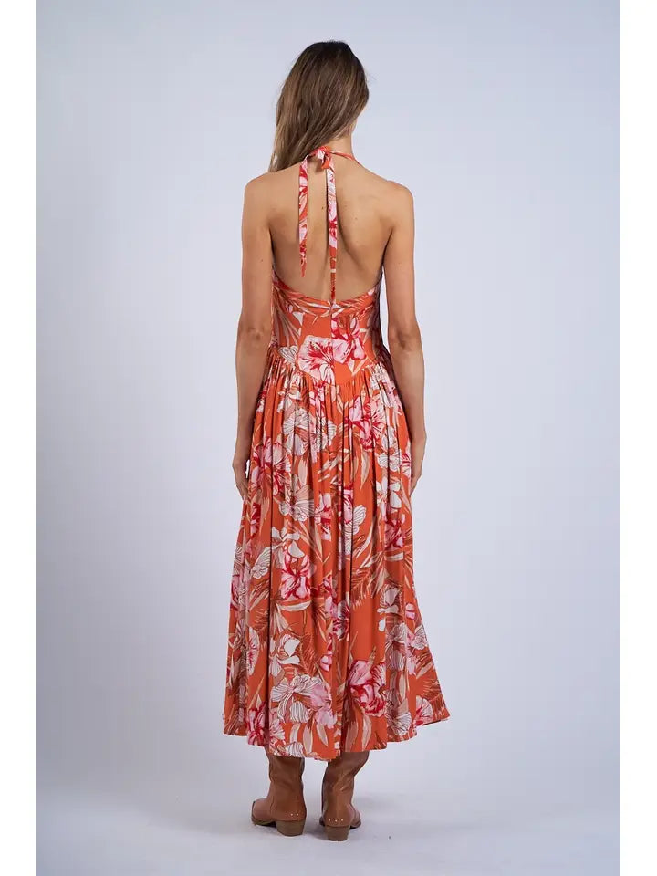 Turn heads in this playful midi dress featuring a vibrant orange tropical print. The square neckline and halter tie add a flirty touch, perfect for sunny days and warm nights. Lightweight and breezy, it’s your go-to for effortless summer style.