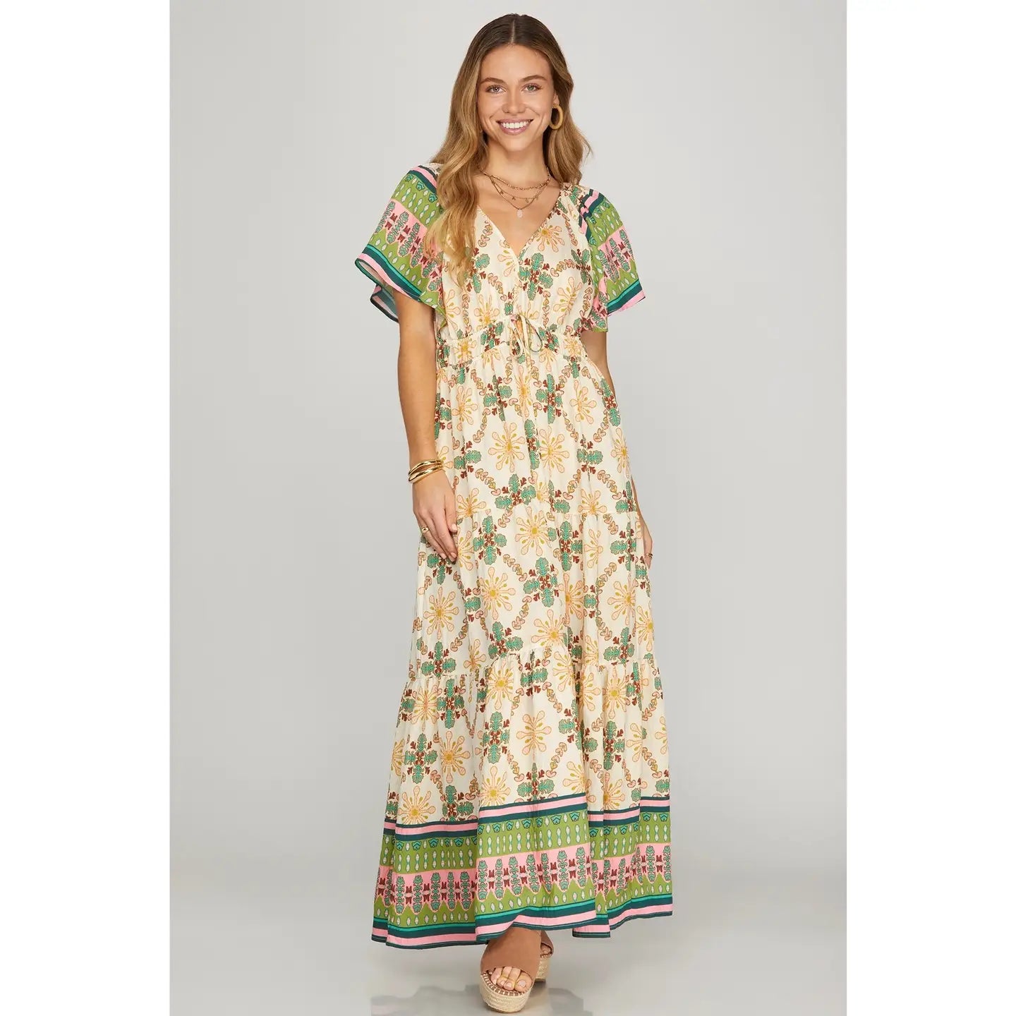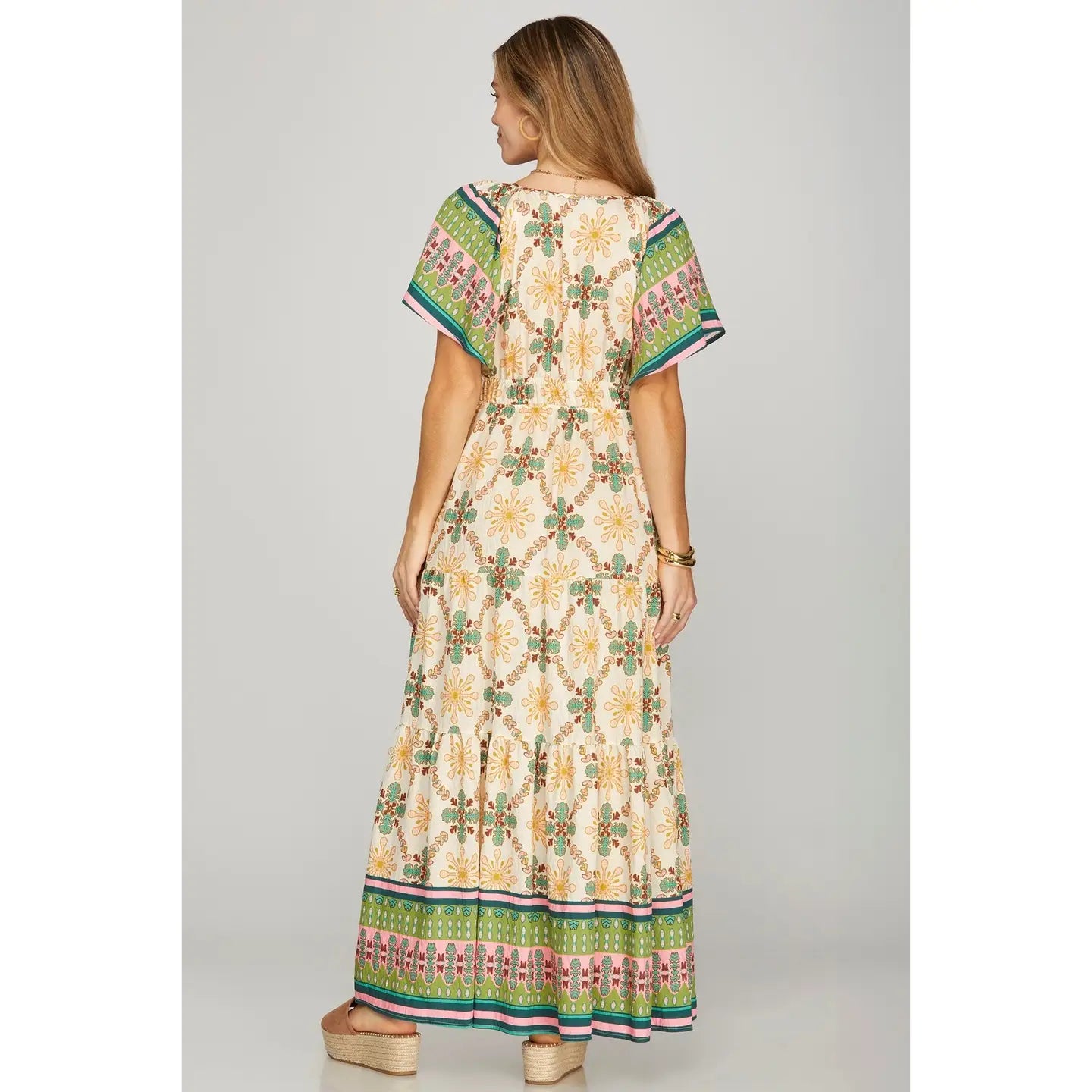 Step into sunshine with this playful green woven print tiered maxi dress. Its flowing tiers create a fun, flirty silhouette perfect for twirling through warm days. Lightweight and breezy, it’s your go-to for effortless style and comfort all season long.