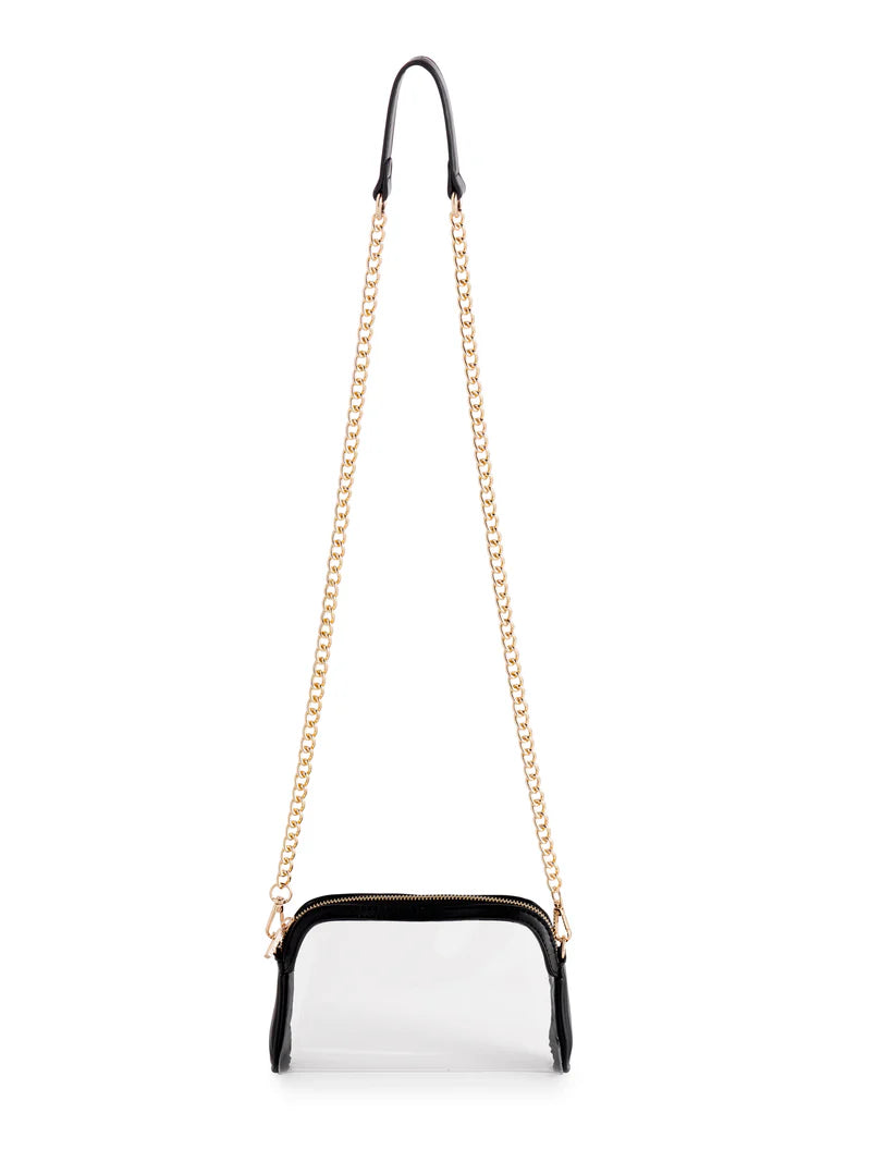 Meet the Taylor Cross-body – your go-to bag for stadium games, concerts, or any event where style and security go hand-in-hand. Made from sleek, transparent PU, this compact cutie is perfect for storing your essentials while staying event-compliant. It features a chic gold chain strap with a vegan leather shoulder detail that’s both comfy and detachable. Swap out the strap to mix and match with your favorite accessories for a personalized twist.