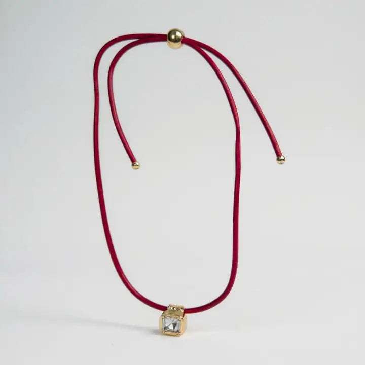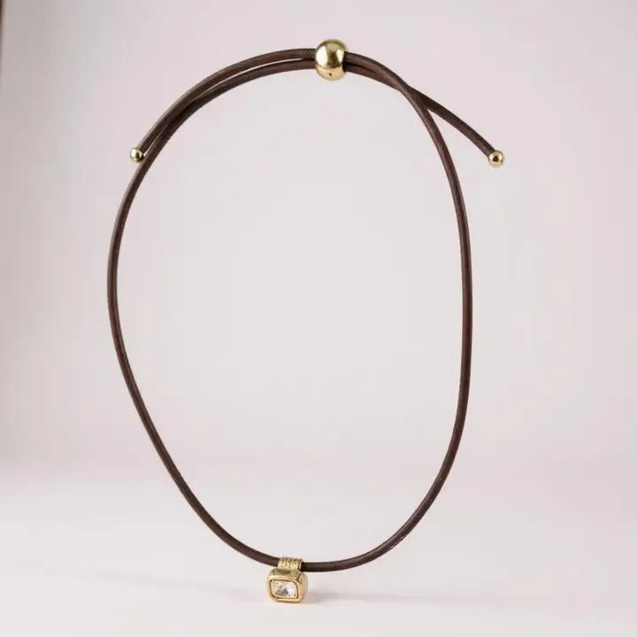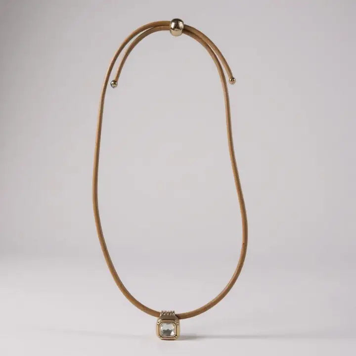 26" adjustable leather cord necklace with 14K gold plated pendant and rhinestone center.