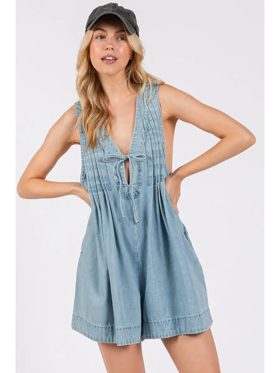 Pleated Tie Denim Romper