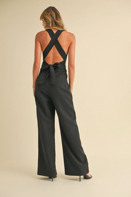 This jumpsuit features a sophisticated rosette plunged neckline that enhances elegance, paired with a stylish criss-cross open back design for a modern, alluring look. The wide-legged silhouette offers both comfort and a flattering fit, making it ideal for formal occasions or statement-making evenings. Crafted to balance bold detailing with effortless wearability, this piece combines fashion-forward design with expert tailoring.