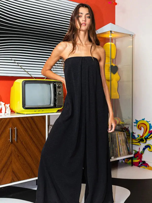 This strapless flowy jumpsuit is your go-to for game day or laid-back weekends. Its breezy design keeps you comfy while turning heads with effortless style. Perfect for cheering on your team or casual hangouts, it’s playful, easy, and ready to move with you all day long.