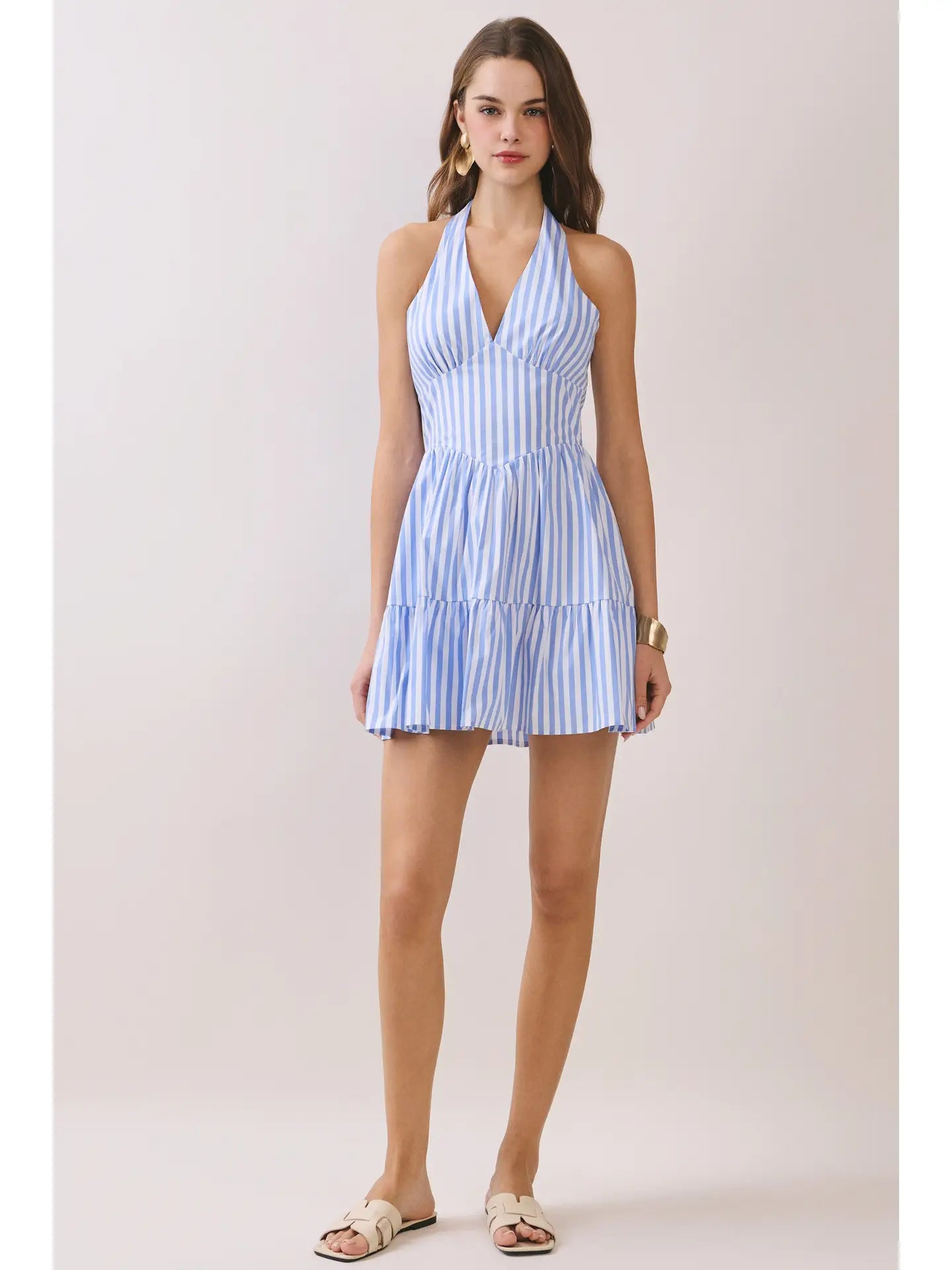Stripes meet sophistication in this flirty mini dress that's ready for any occasion. The halter neckline and plunging V-neck create an effortlessly chic front, while the fitted bodice hugs your curves just right. A gathered waist seam transitions into a playful tiered skirt that moves with you, and the open back with zipper closure adds an unexpected touch of allure. Perfect for turning heads at brunch, parties, or nights out.