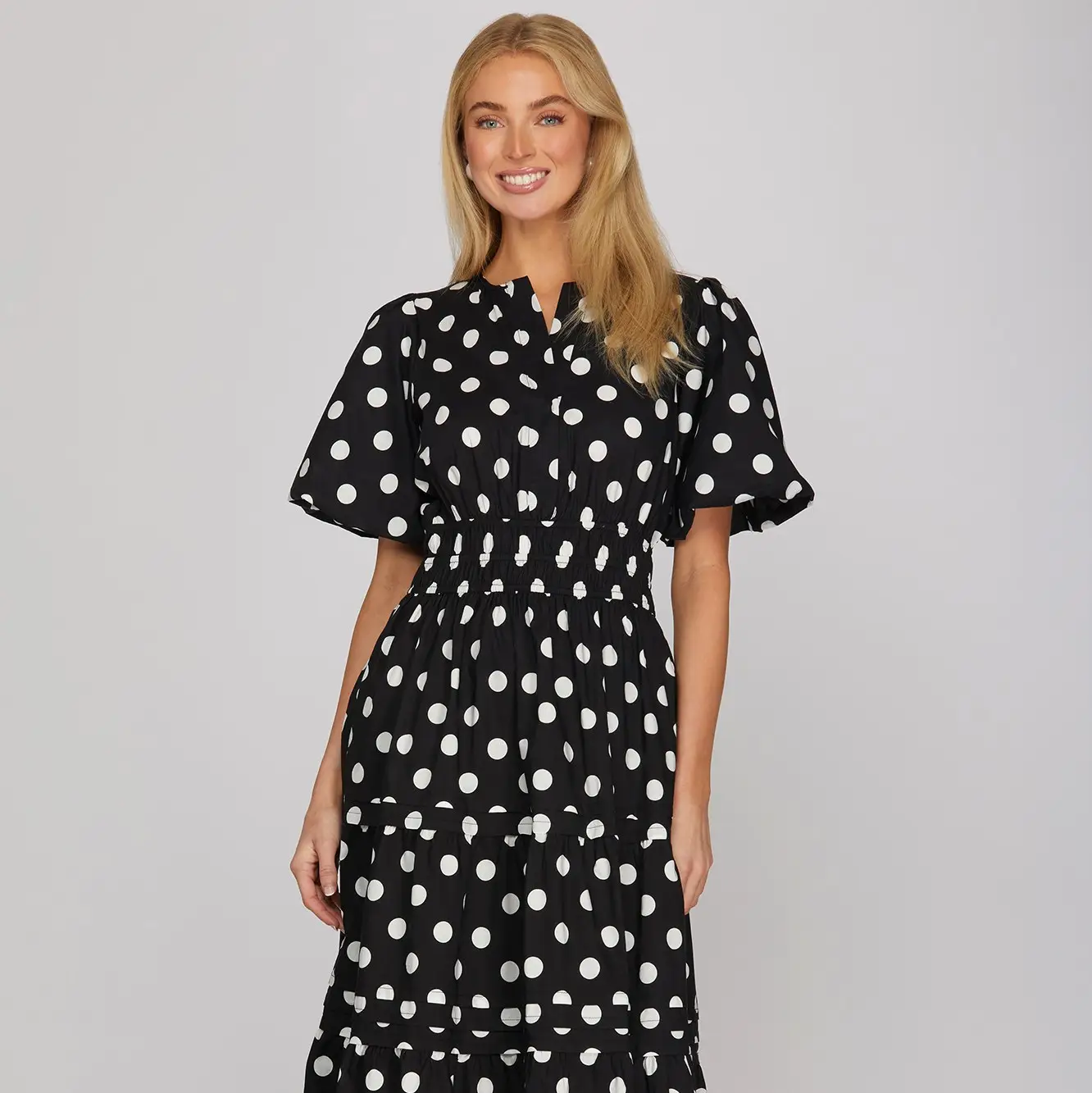 Elevate your everyday style with this charming polka dot midi dress. Featuring delicate pintucks down the bodice for added dimension, comfortable puff sleeves, and a fitted waist with elastic for a flattering silhouette. The woven fabric drapes beautifully while the practical pockets keep your essentials close. Perfect for casual outings, brunch dates, or weekend adventures—a versatile piece that transitions effortlessly from day to night.