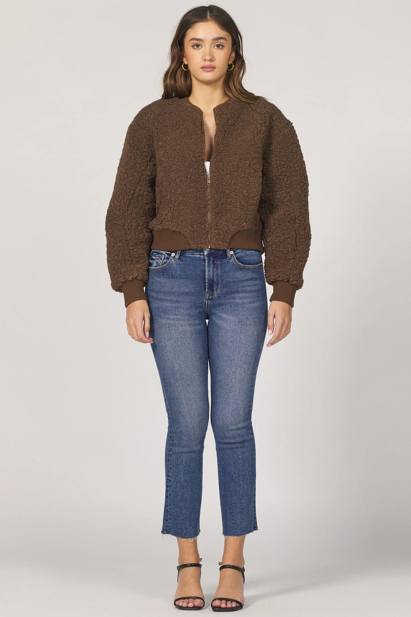 Timeless Felicia long sleeve bomber jacket. Features a cozy yet polished sherpa perfect for cooler nights. The relaxed fit with zipped front provides versatility, comfort for warmth and style that is deal for transitioning between seasons.