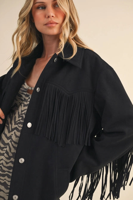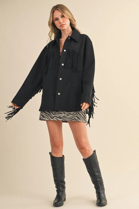 Experience effortless style with the Suede Tassle Jacket, expertly crafted from a 94% polyester blend for durability and comfort. Its oversized silhouette ensures a relaxed fit, while the distinctive suede fringe details add texture and movement, making this jacket a compelling statement piece for your wardrobe. Ideal for layering, it combines contemporary design with timeless appeal.