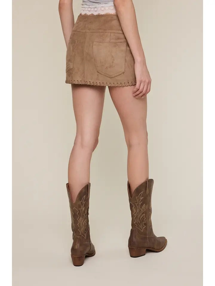 Step out in style with this playful suede mini skirt, designed in a vibrant solid color that adds a fun pop to your outfit. Detailed with distinctive stitching points for a chic, crafted look, it comes with a matching belt and buckle to cinch your waist perfectly. Whether you're dressing up for a night out or adding flair to your casual wear, this skirt brings a youthful edge to any wardrobe.
