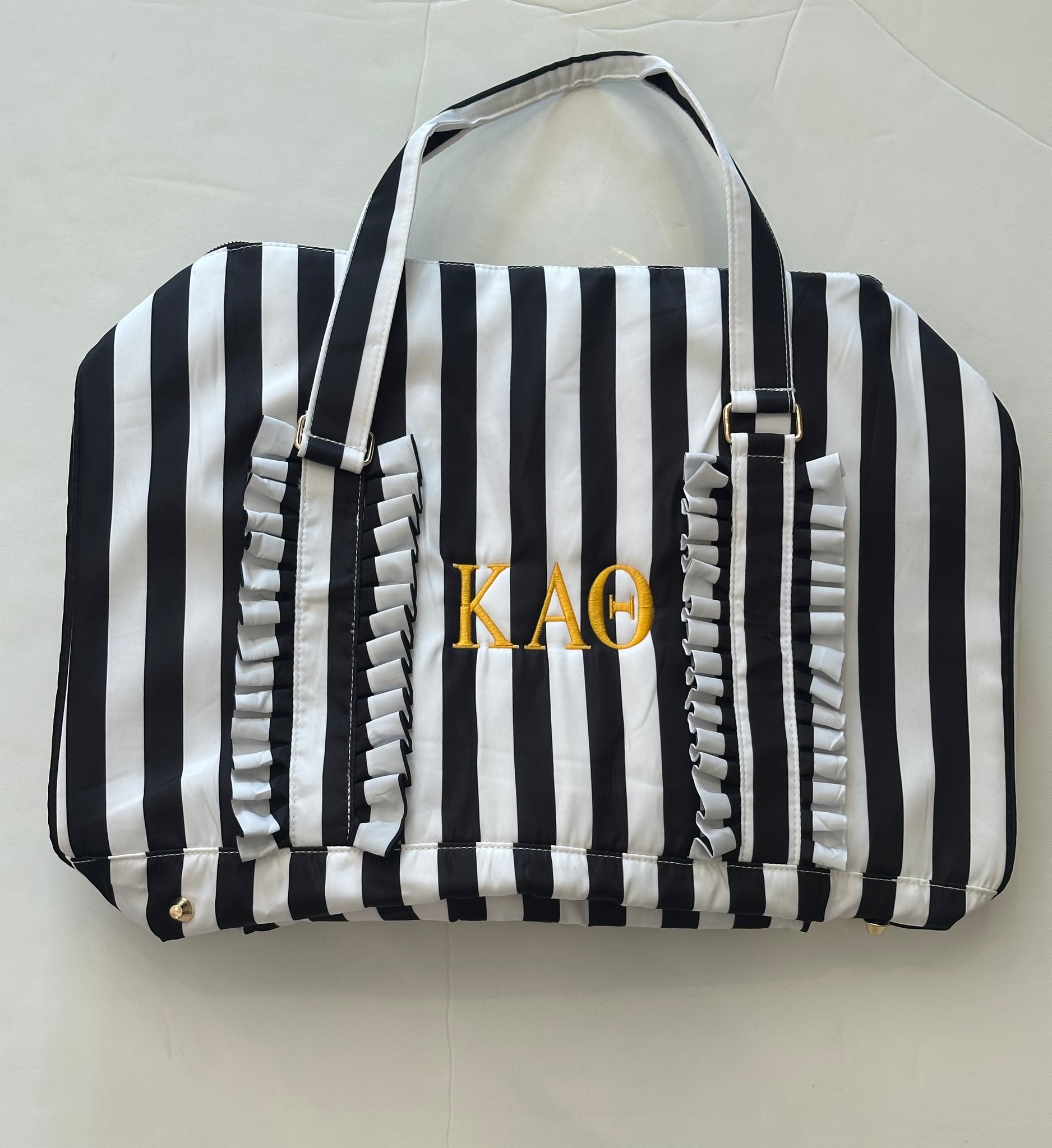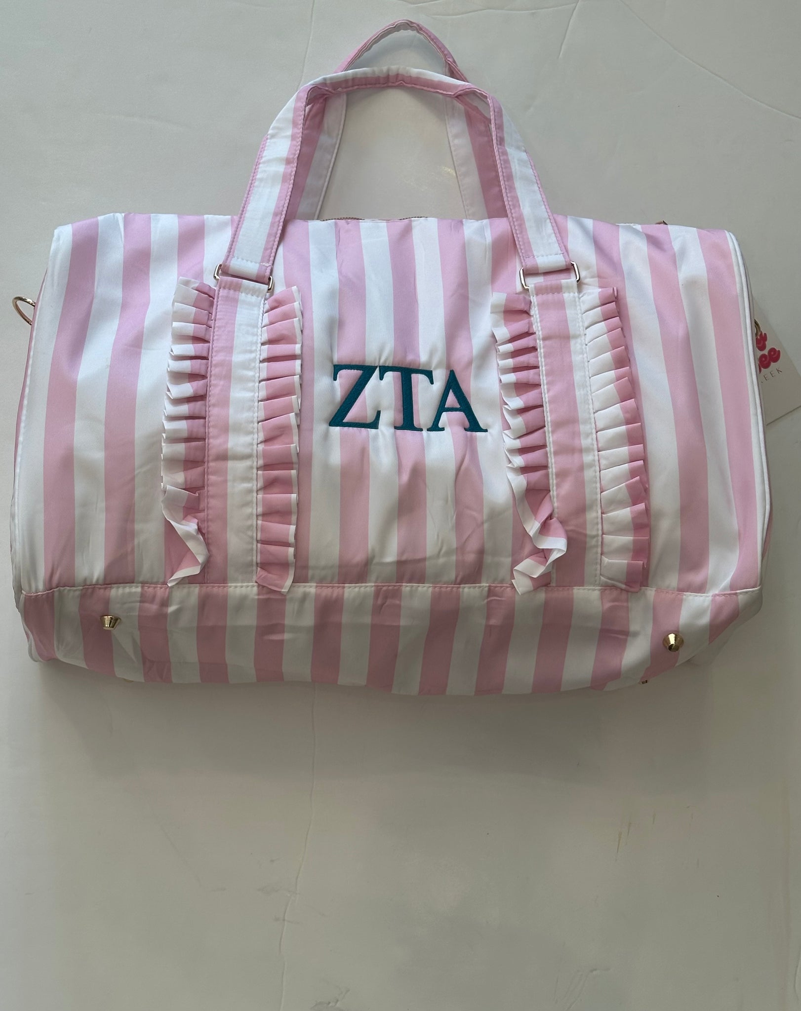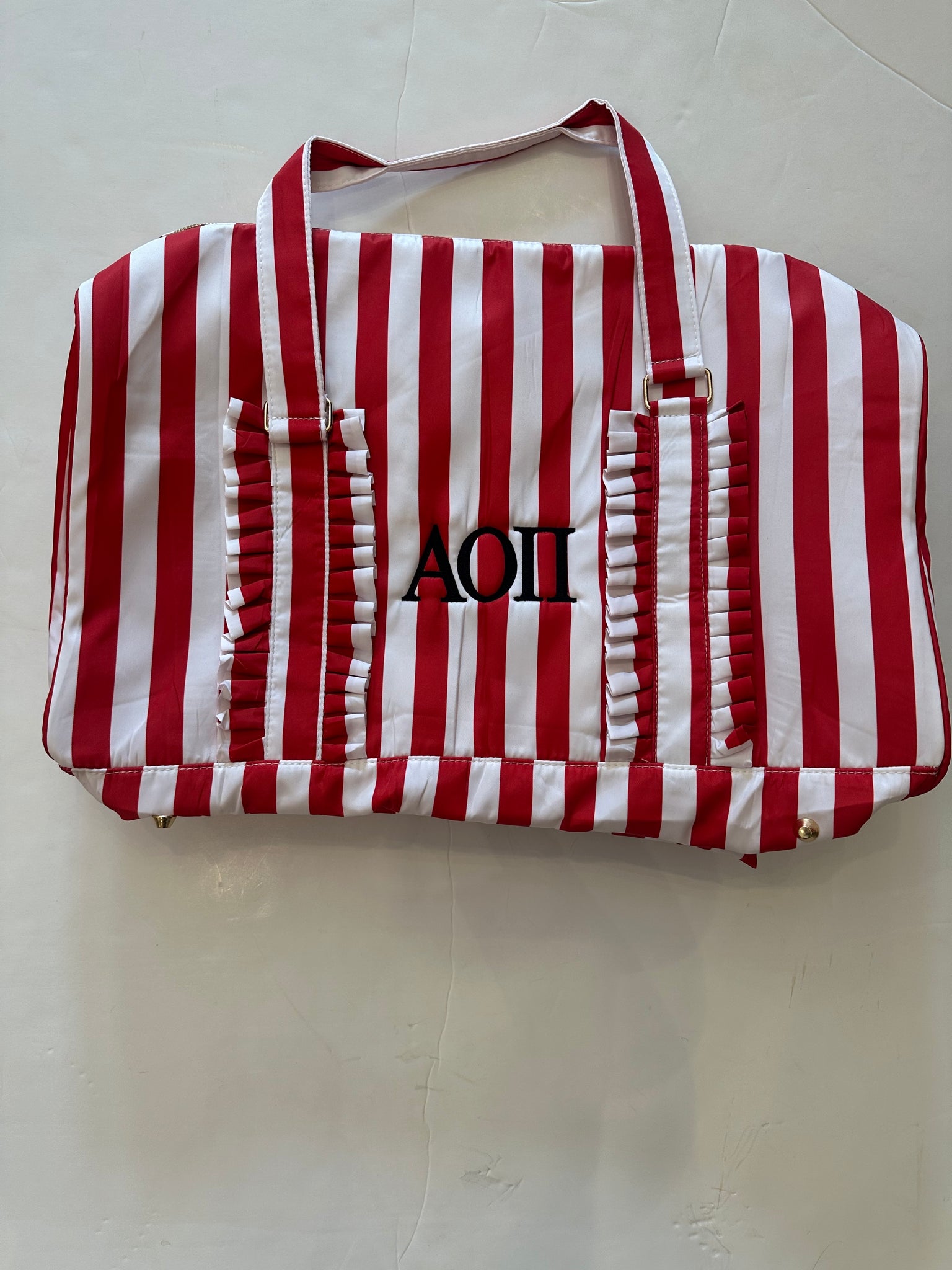 This bag is everything! Striped travel bag in sorority colors, monogramed sorority letters. Comes with shoulder strap. Size of bag is 22" x 9" x 12"
