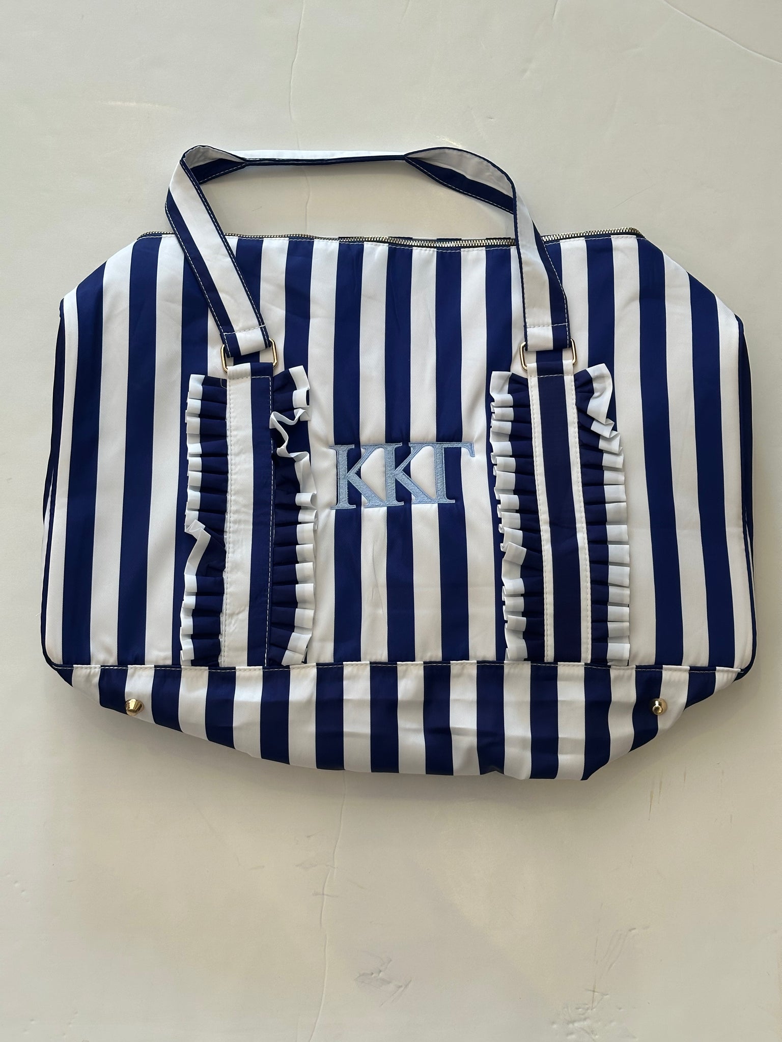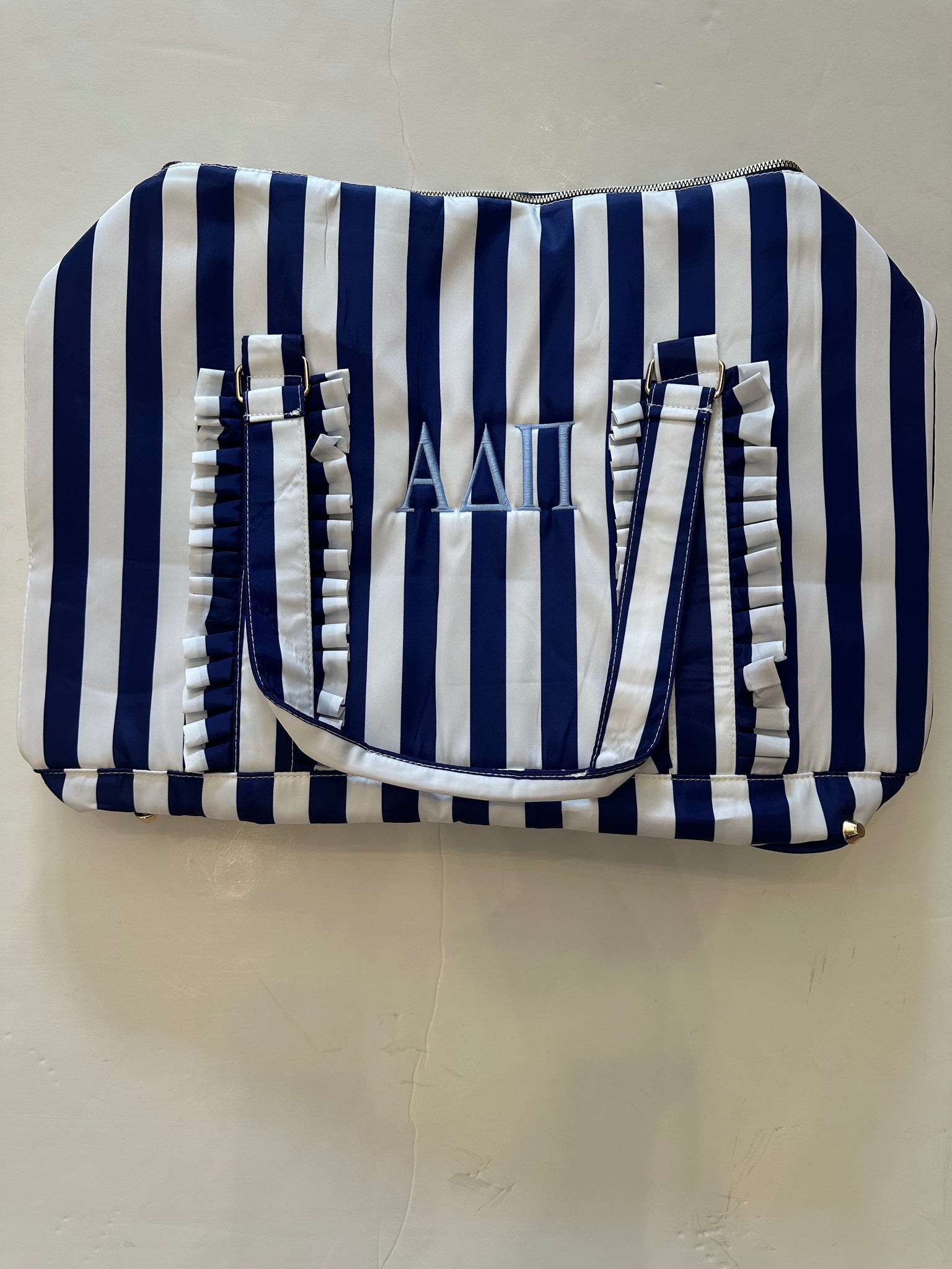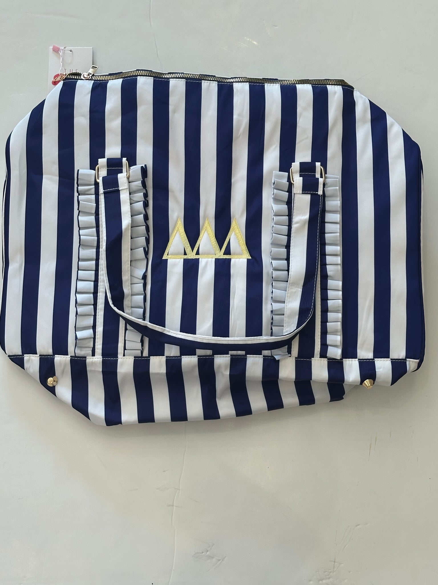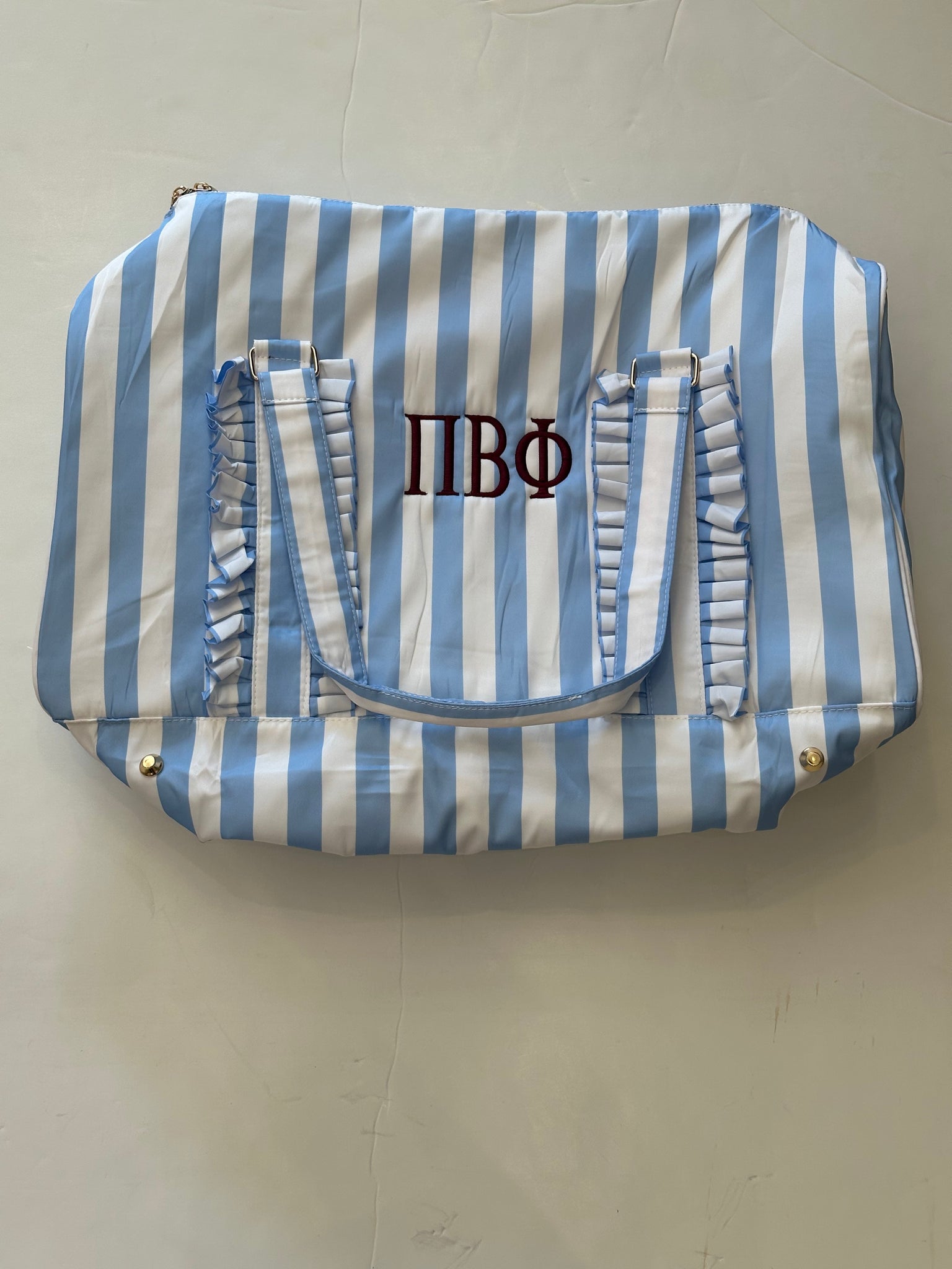 This bag is everything! Striped travel bag in sorority colors, monogramed sorority letters. Comes with shoulder strap. Size of bag is 22" x 9" x 12"