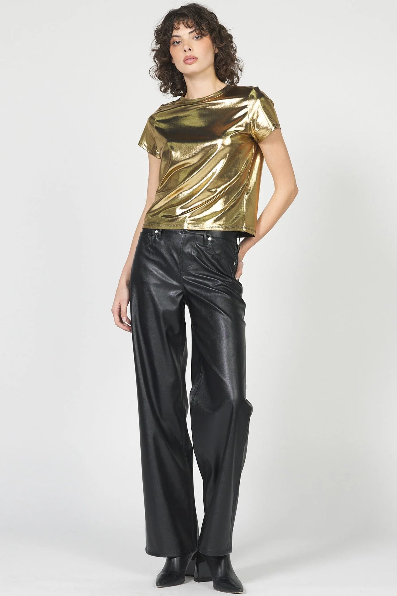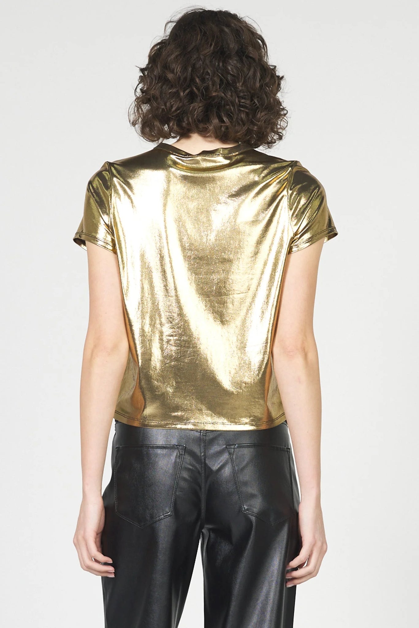 Guild in glam with our liquid metal Unity short sleeve crew neck. This statement piece combines shimmering with ultimate comfort, featuring metallic sheen that dazzles. Perfect for layering or wearing solo, it's a versatile allure to your wardrobe!
