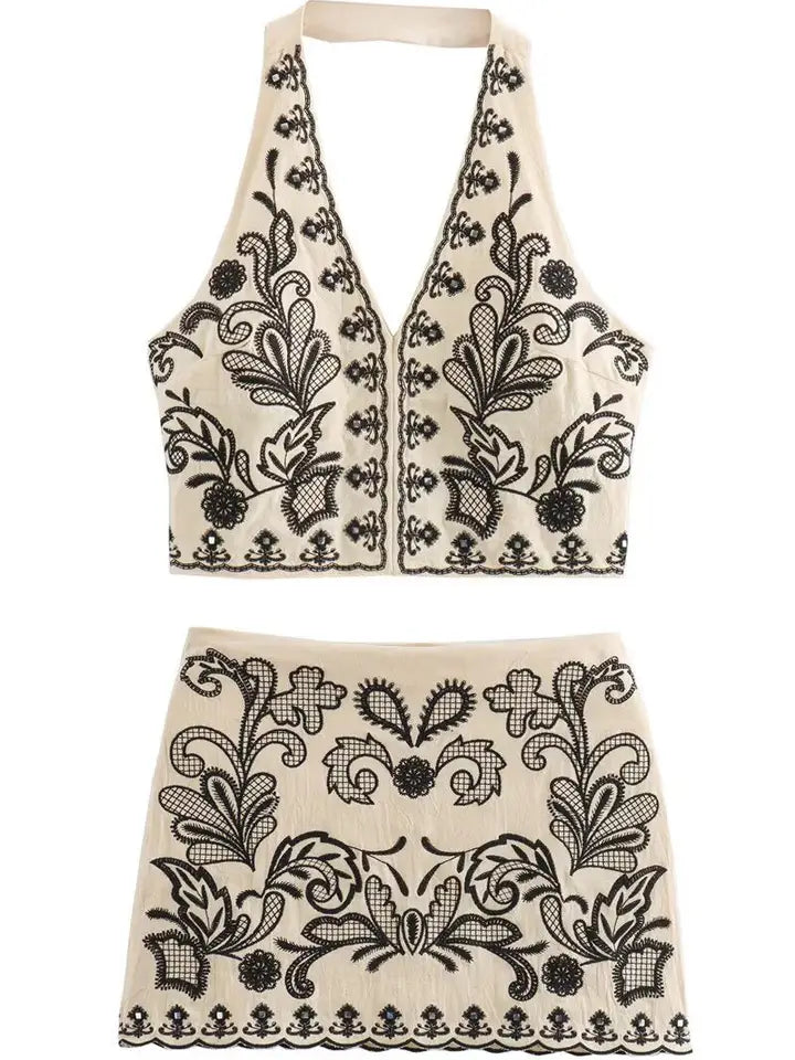 Your new standout set features intricate stitching on both the halter crop top and mini skirt. Perfect for parties, vacations, or festivals.