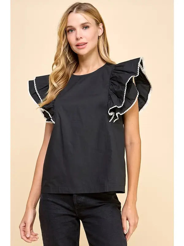 Elevate your wardrobe with this adorable black and white ruffle sleeve top! The playful contrast trim adds a touch of whimsy, while the charming ruffle sleeves bring movement and fun to your everyday style. Perfect for pairing with jeans for casual outings or dressing up with a skirt for special occasions!