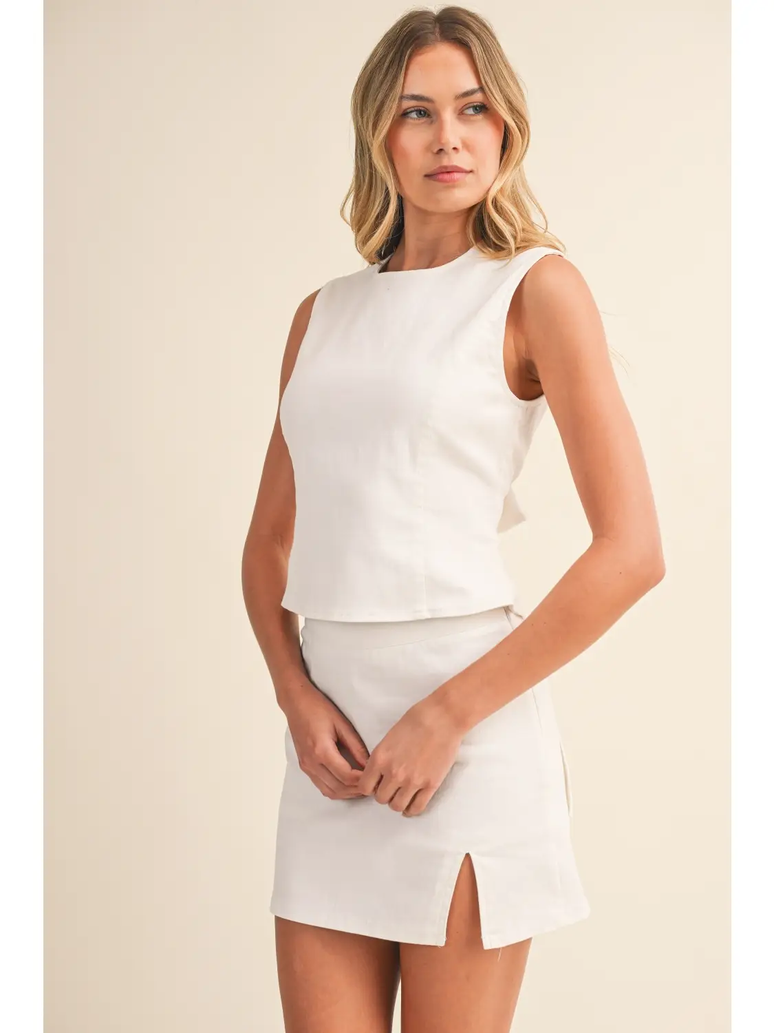 Effortless elegance meets comfort in this two-piece set. The stretch cotton twill open back top features a flattering silhouette with breathable fabric, while the coordinating mini skirt offers a sleek, versatile look. Perfect for warm weather styling, this set transitions seamlessly from casual outings to evening occasions. The quality twill construction ensures durability and a polished appearance that works year-round.