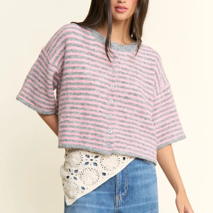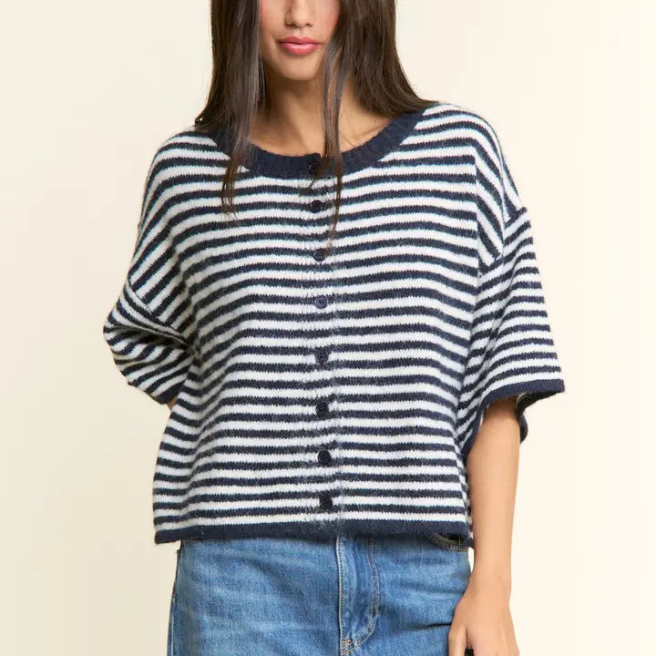 Layer effortlessly with this charming striped knit cardigan. Featuring classic button-up styling and a soft, comfortable fit, it's the perfect piece for adding warmth and dimension to any outfit. The timeless stripe pattern pairs beautifully with basics or patterns alike, making it a versatile wardrobe essential that works season after season.
